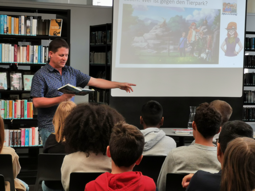 Marcel Naas, ein Zürcher Autor, präsentierte drei Klassen des Notkerschulhauses am Montag, 2. Mai 2022 seine Buchreihe MounTeens und begeisterte mit seiner Lesung die Kinder im Mittelstufenalter.