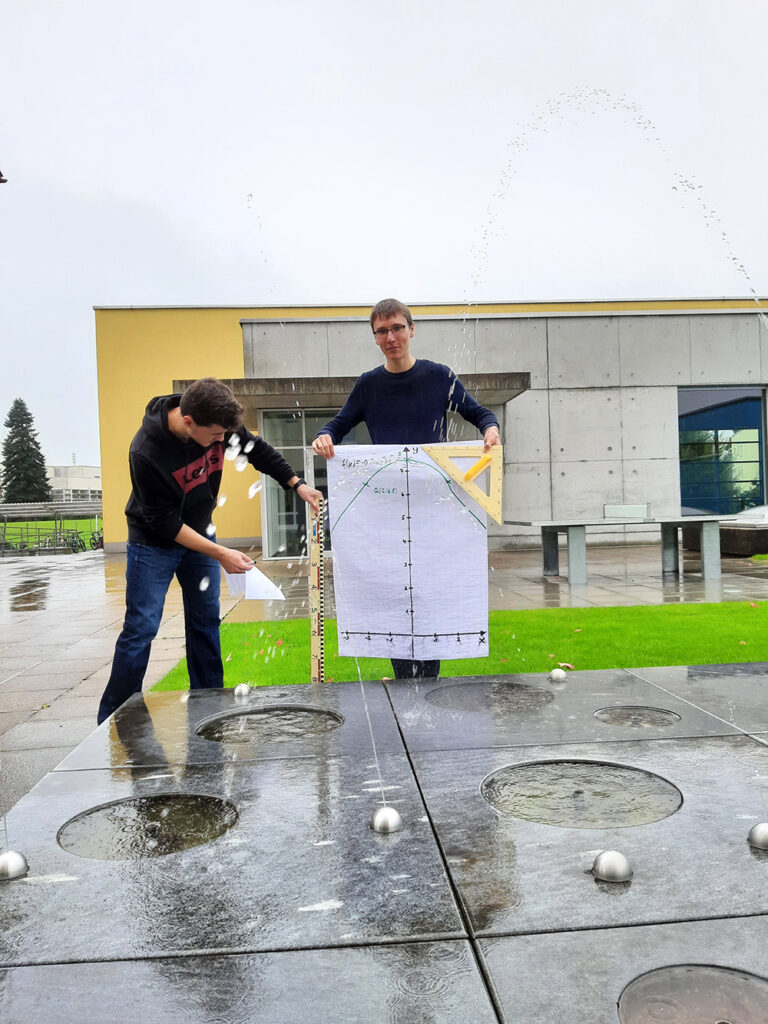 Zum Abschluss der Unterrichtseinheit «Quadratische Funktionen» zeigten die 4. Klassen, dass sie mit Parabeln, also mit den Schaubildern dieser quadratischen Funktionen, sicher umgehen können. So wurde die parabelförmige Kurve des Wasserstrahls vom Schulbrunnen vermessen, die Flugbahn eines Frosches beim Sprung erforscht und auf einer Spielvorlage um die meisten richtigen Zuordnungen von Funktionsgleichung und Schaubild gekämpft.